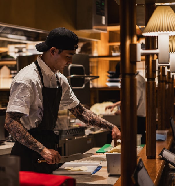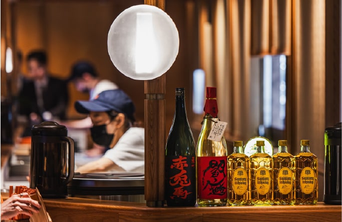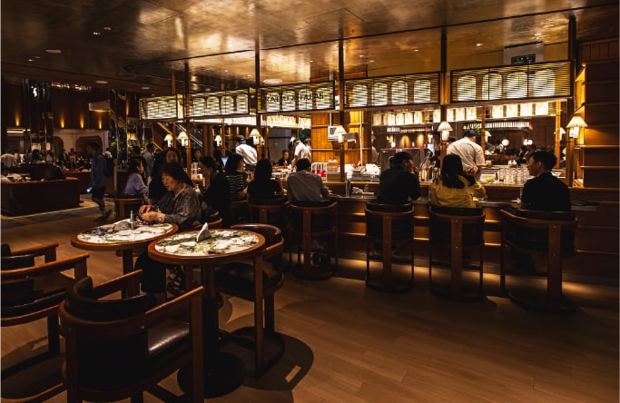 活気ある交流が生まれるカウンター席を中心に、テーブル席や個室も設けられ、訪れる人それぞれが思い思いのスタイルで食事を愉しむことができる。食の探求と空間美を融合させるHOUSEの理念が、ここにも息づいている。
